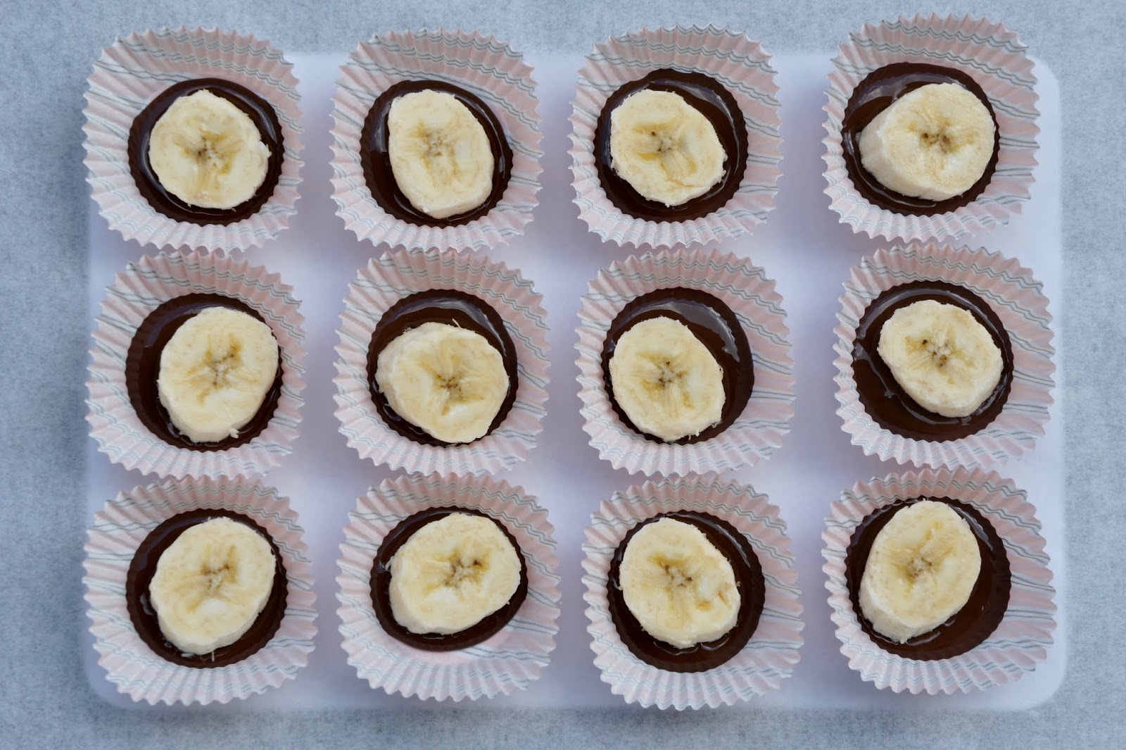 Die Kuvertüre im Wasserbad schmelzen und mit dem Kokosöl cremig rühren. Jeweils 1 TL in die kleinen Muffinförmchen geben. Die Bananen in Scheiben schneiden und jeweils eine Scheibe auf die Kuvertüre geben. Die Erdnussbutter leicht erhitzen bis sie schön flüßig ist und 1 TL auf die Bananenscheiben geben und nochmal 1 TL Kuvertüre darüber verteilen. Für mind. 2 Stunden im Gefrierfach fest werden lassen und genießen!